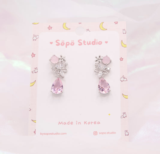 Pastel Pink Crystal Heart Planet Dangle Korean Dainty Style Earrings