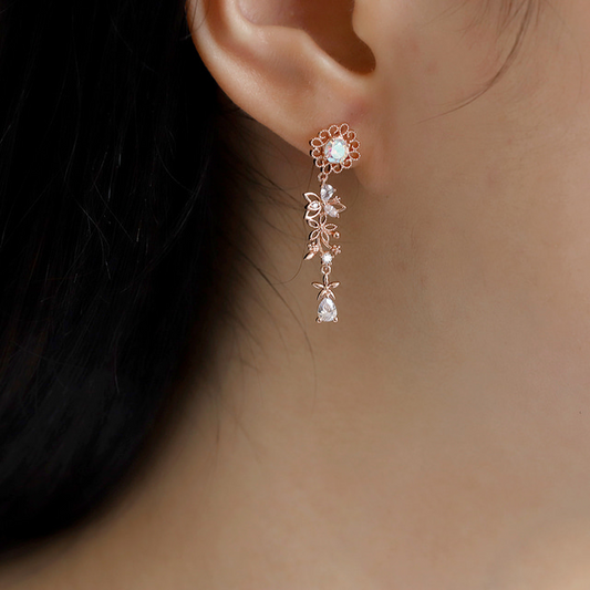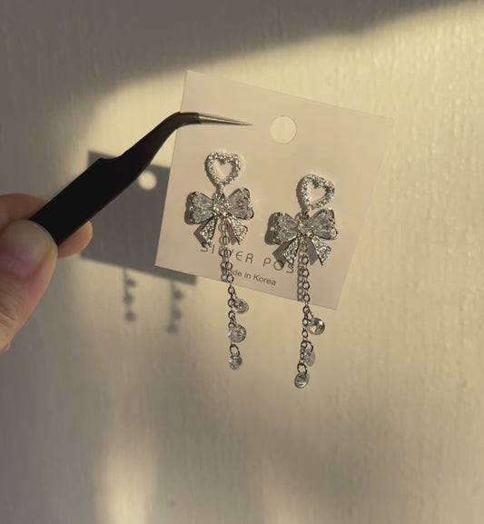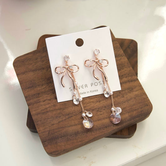 Korean Rose Gold Ribbon Crystal Chained Drop Earrings - Silver posts