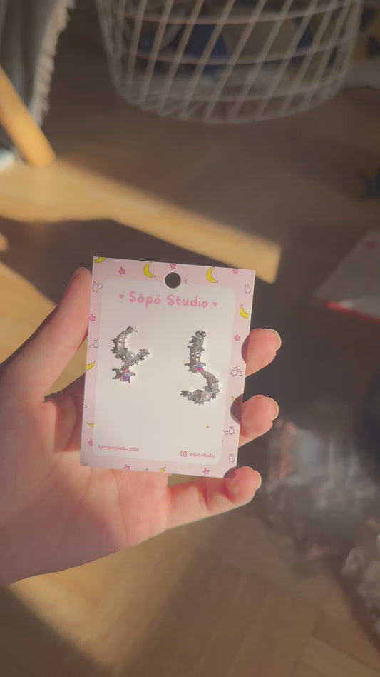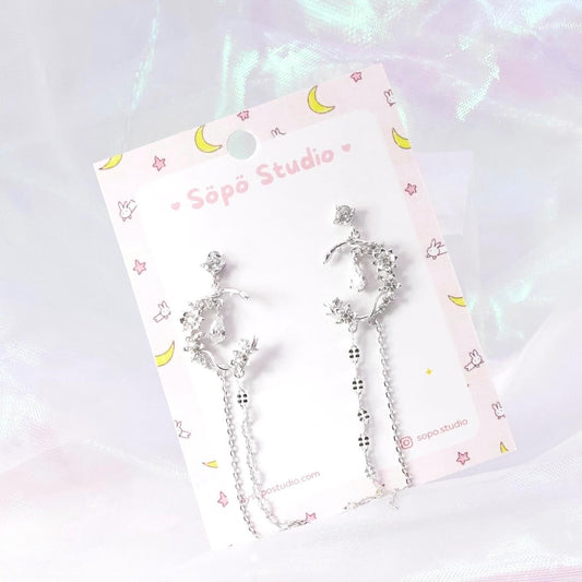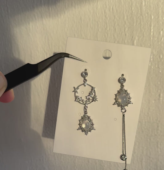 Mis-matched Moon Star Crystal Magical Silver Studs Cute Dangle Earrings