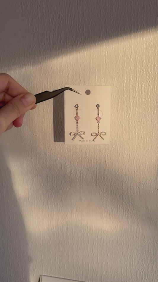 Ribbon Pink Pastel Crystal Dangle Cute Korean Earrings