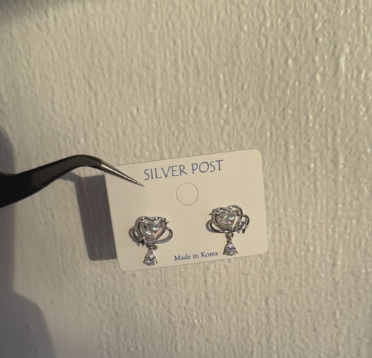 Cute Heart Ribbon Crystal Drop Korean Dainty Style Earrings - Silver Posts