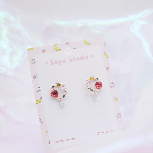 Fairy Garden Flower Wreath Red Heart Studs Earrings