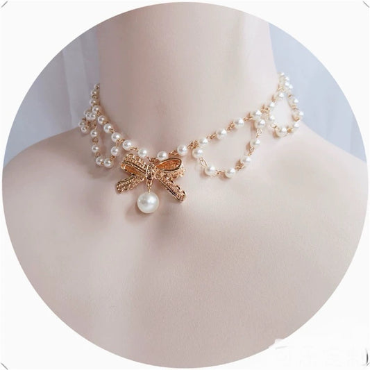 Handmade Fairy Double Layered Ribbon Pearl Drop Choker