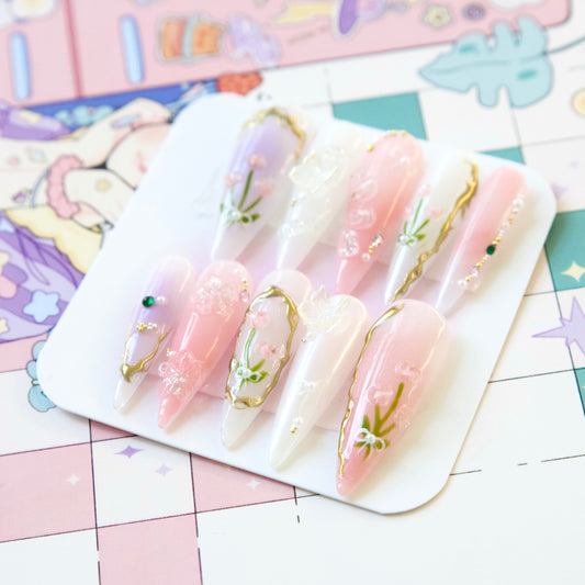 Lily Flower Garden Hand Draw 3D Gel Handmade Press-on Nails