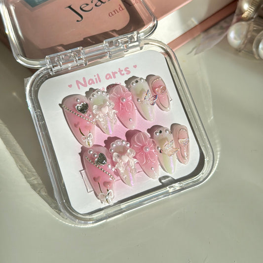 Gradient Pink Butterfly Pearl Handmade Press-on Nails