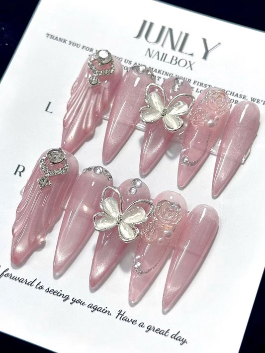 Magical Butterfly Pastel Pink Cat Eye Effect Handmade Press-on Nails