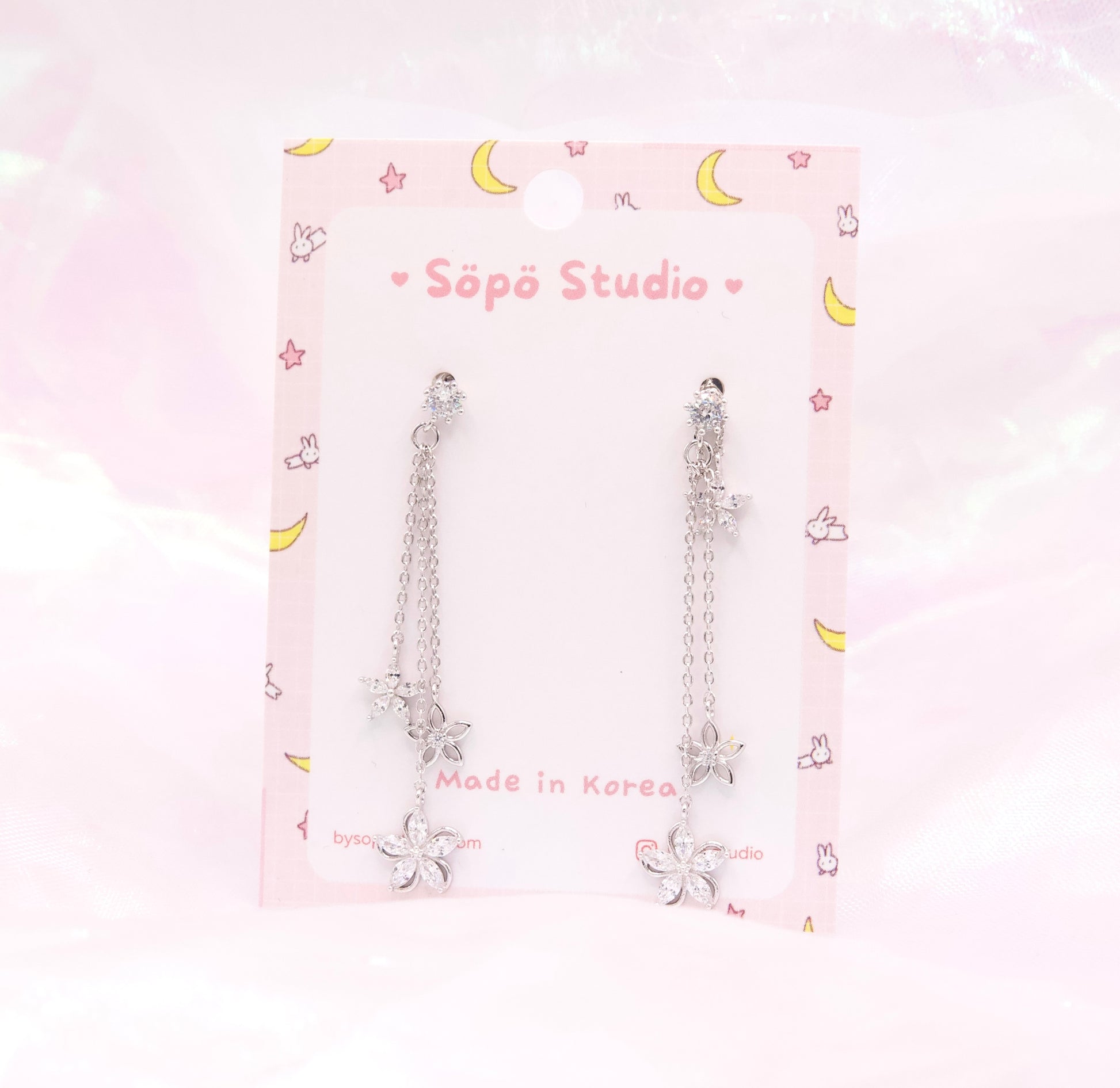 Crystal Flower Triple Chain Drop Dangle Korean Dainty Style Earrings