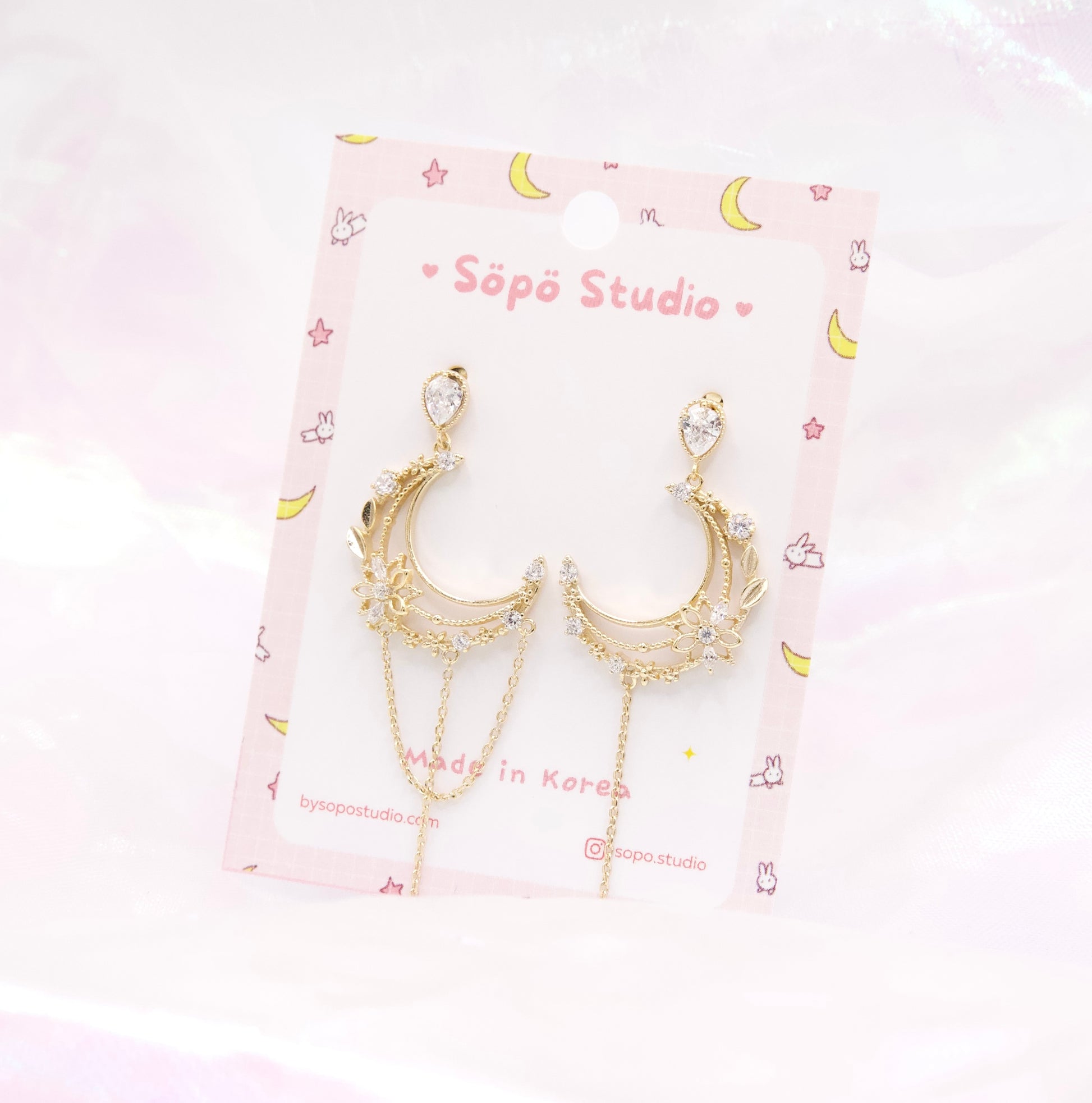 Asymmetric Crescent Moon Chained Drop Dangle Korean Dainty Style Earrings - 2 colors