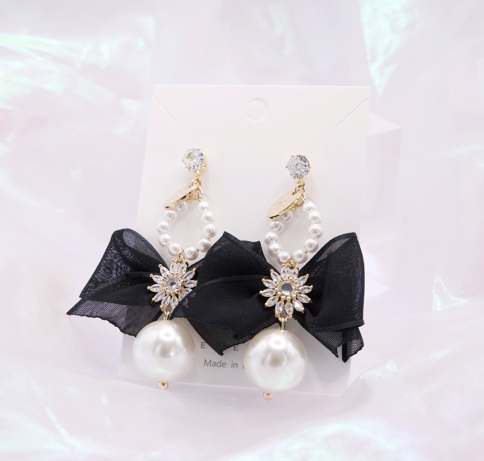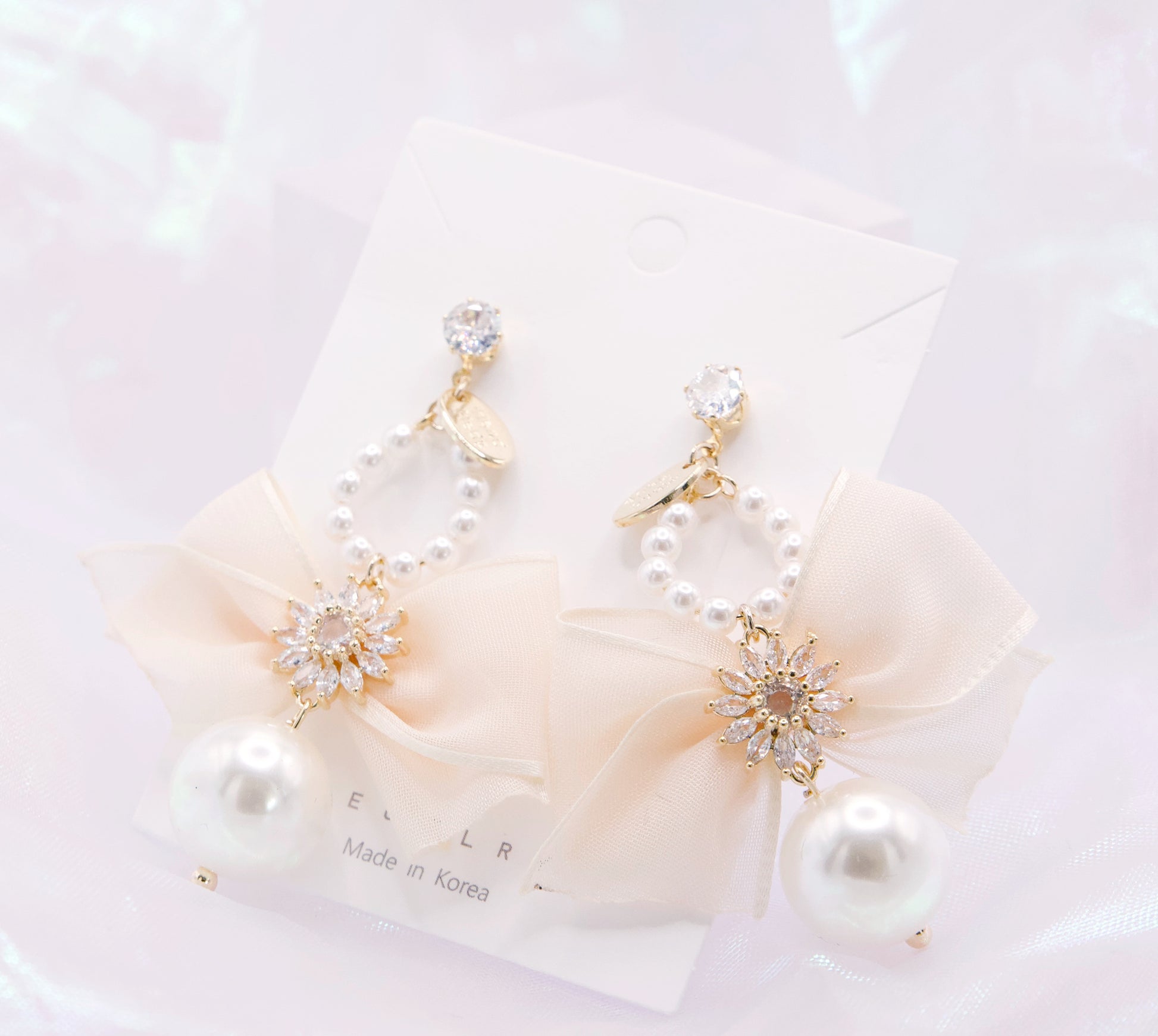 Crystal Charm Bow Pearl Drop Statement Korean Earrings