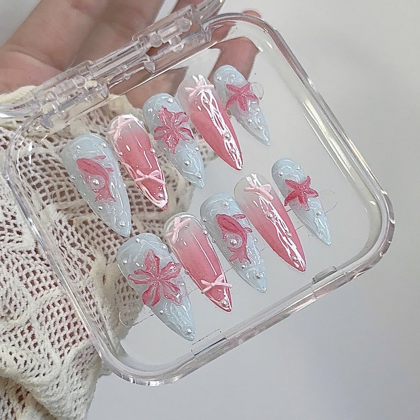 Handmade Y2K Koi Fish Blue Pink 3D Gel Oceanic Press-on Nails