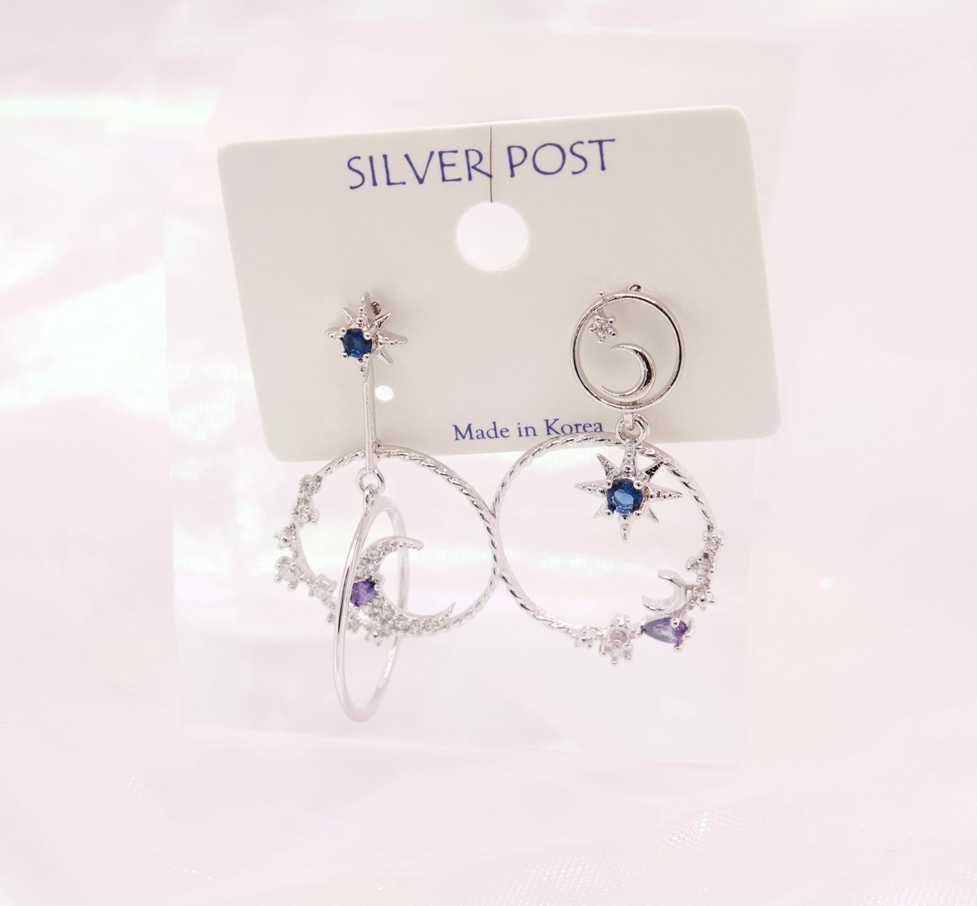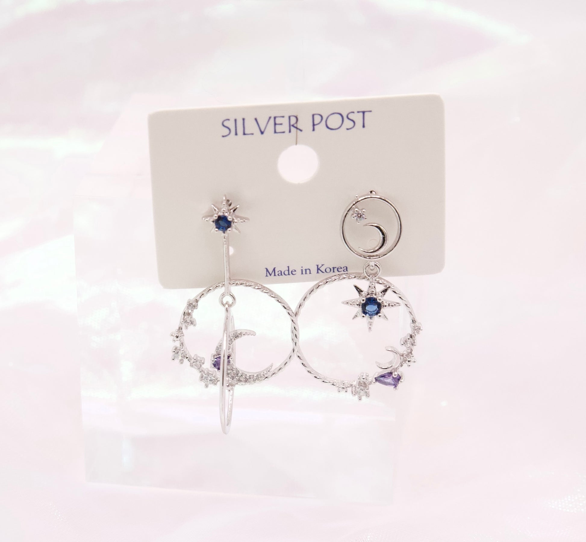 Mis-matched Saphire Blue Moon Planet Princesscore Dangle Korean Dainty Style Earrings