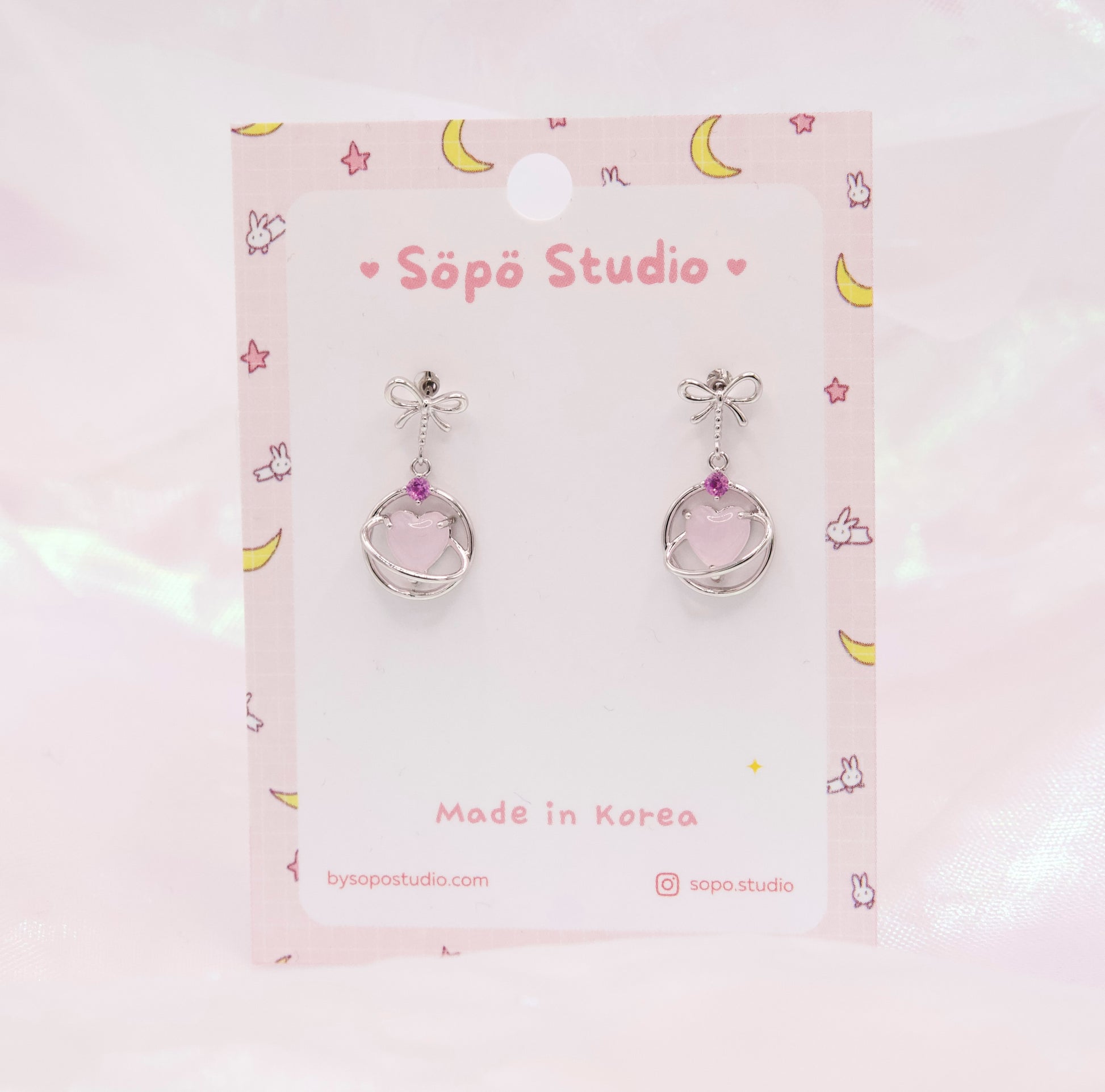 Pastel Pink Crystal Heart Planet Dangle Korean Dainty Style Earrings